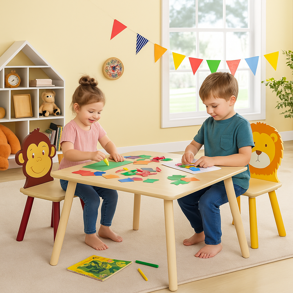 Wooden Kids Table & Chairs | Jungle Monkey & Lion | 3-6 Years